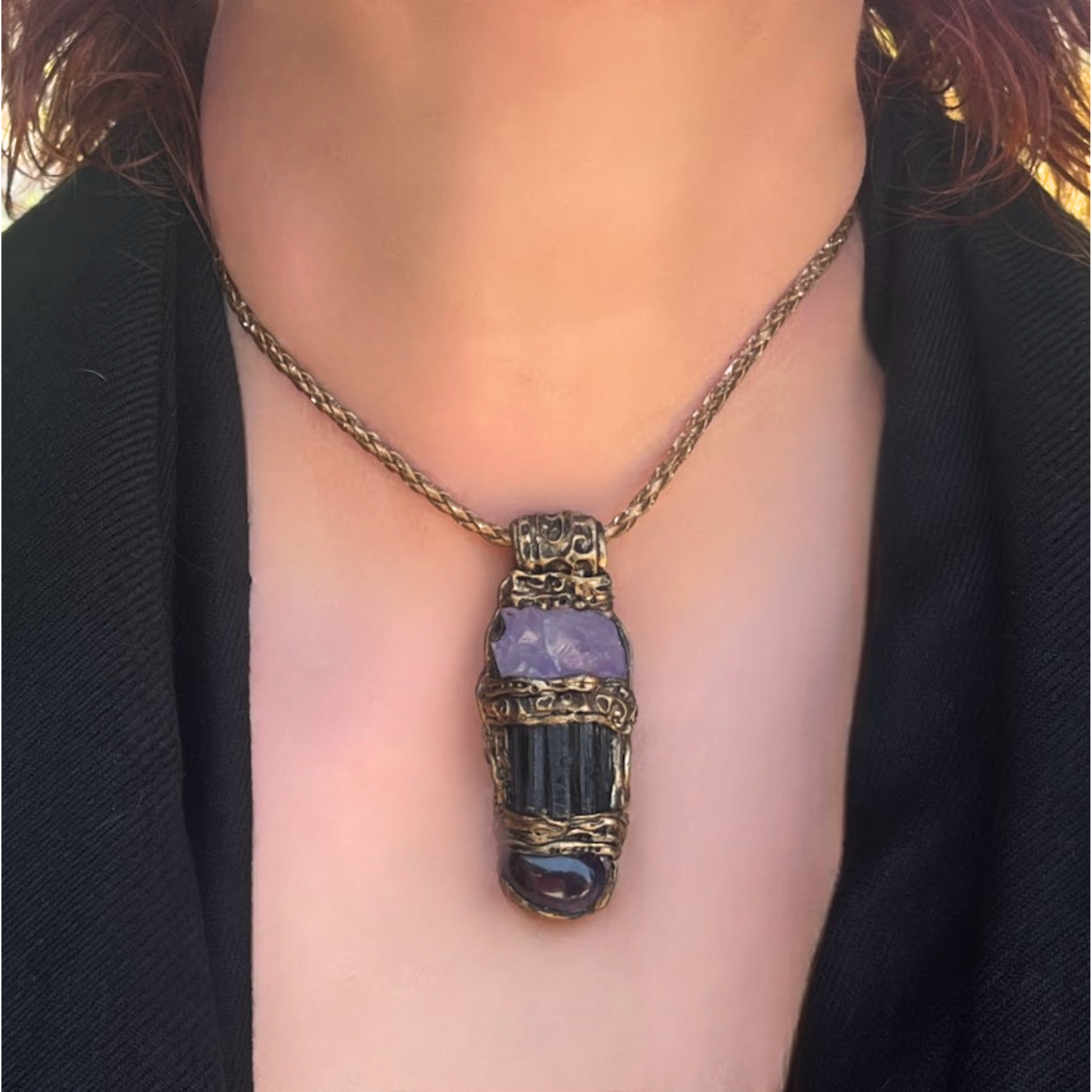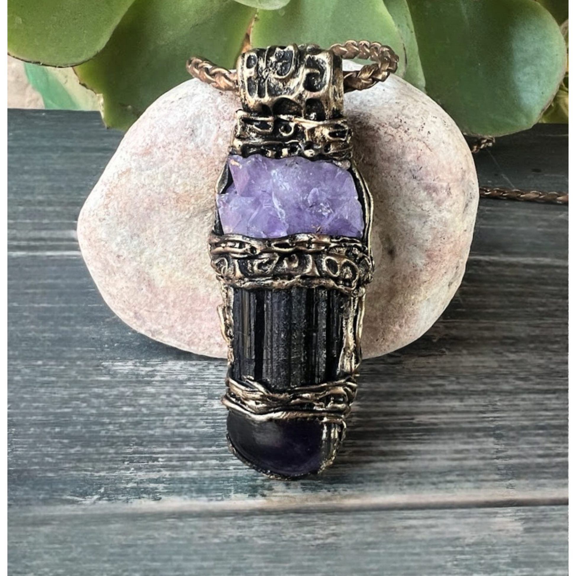 Materials: Raw Black Tourmaline, Raw Amethyst, brass clasp, bronze cord, polymer clay.