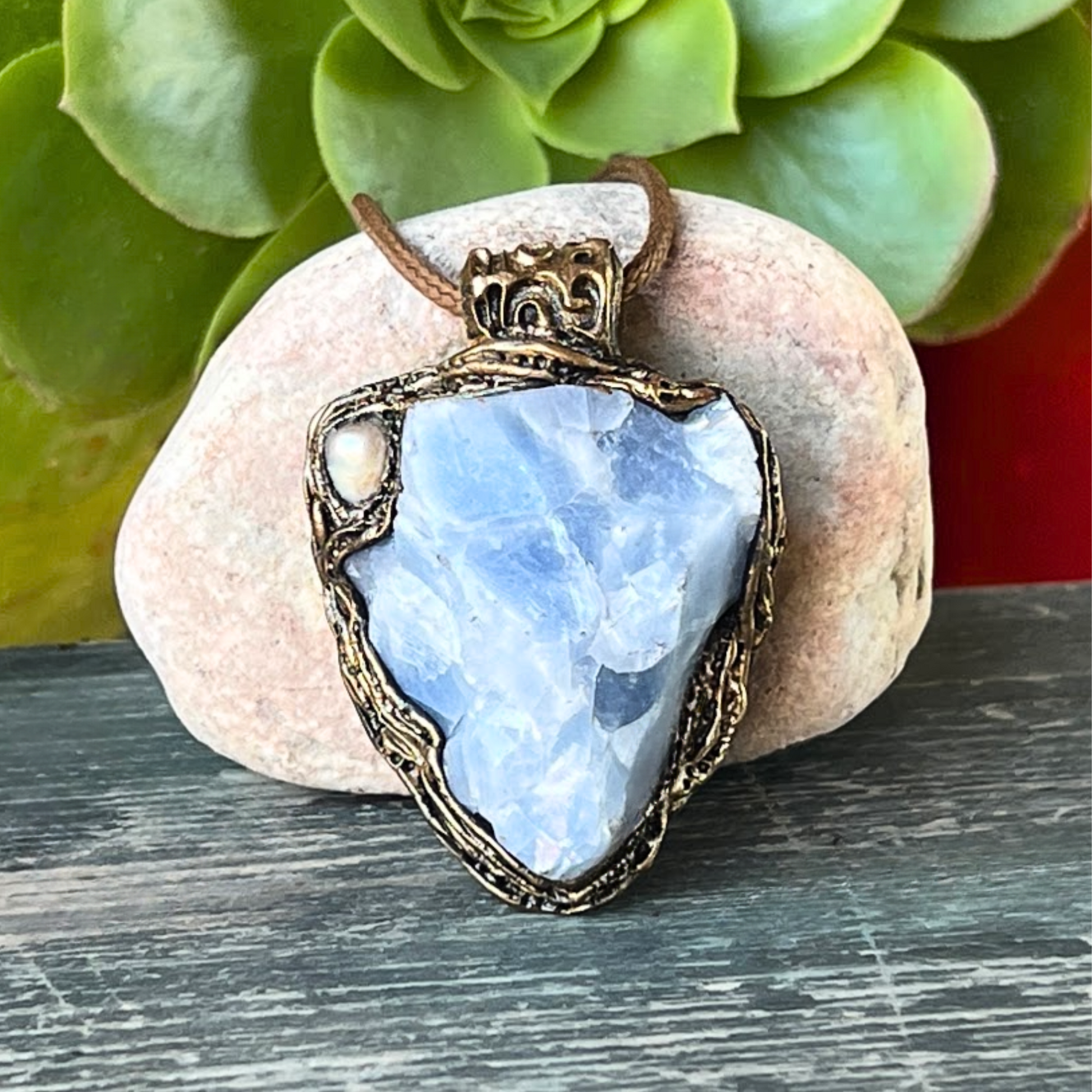 Materials: Raw Blue Calcite, freshwater pearl, brass clasp, brown cord, polymer clay.