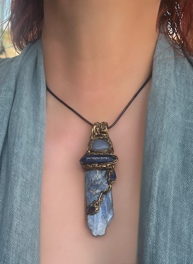 Materials: Blue Kyanite, Lapis Lazuli, bronze cord with brass clasp, polymer clay.