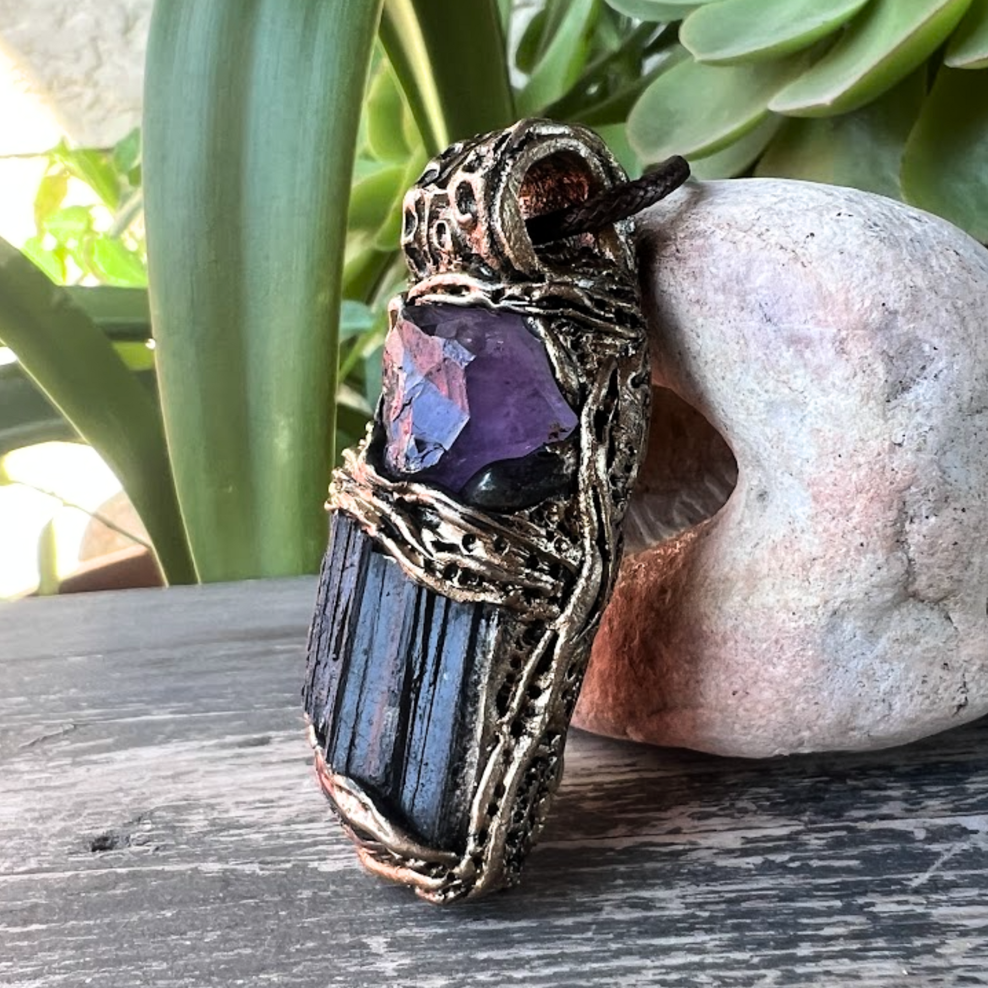 Materials: raw Black Tourmaline, raw Amethyst, Hematite, bronze cord with brass clasp, polymer clay.