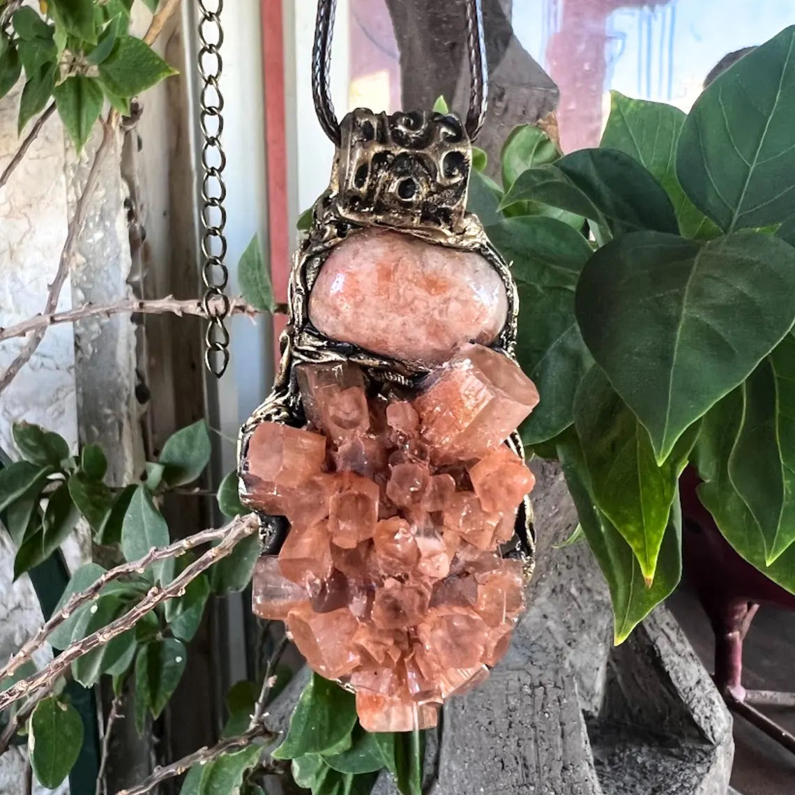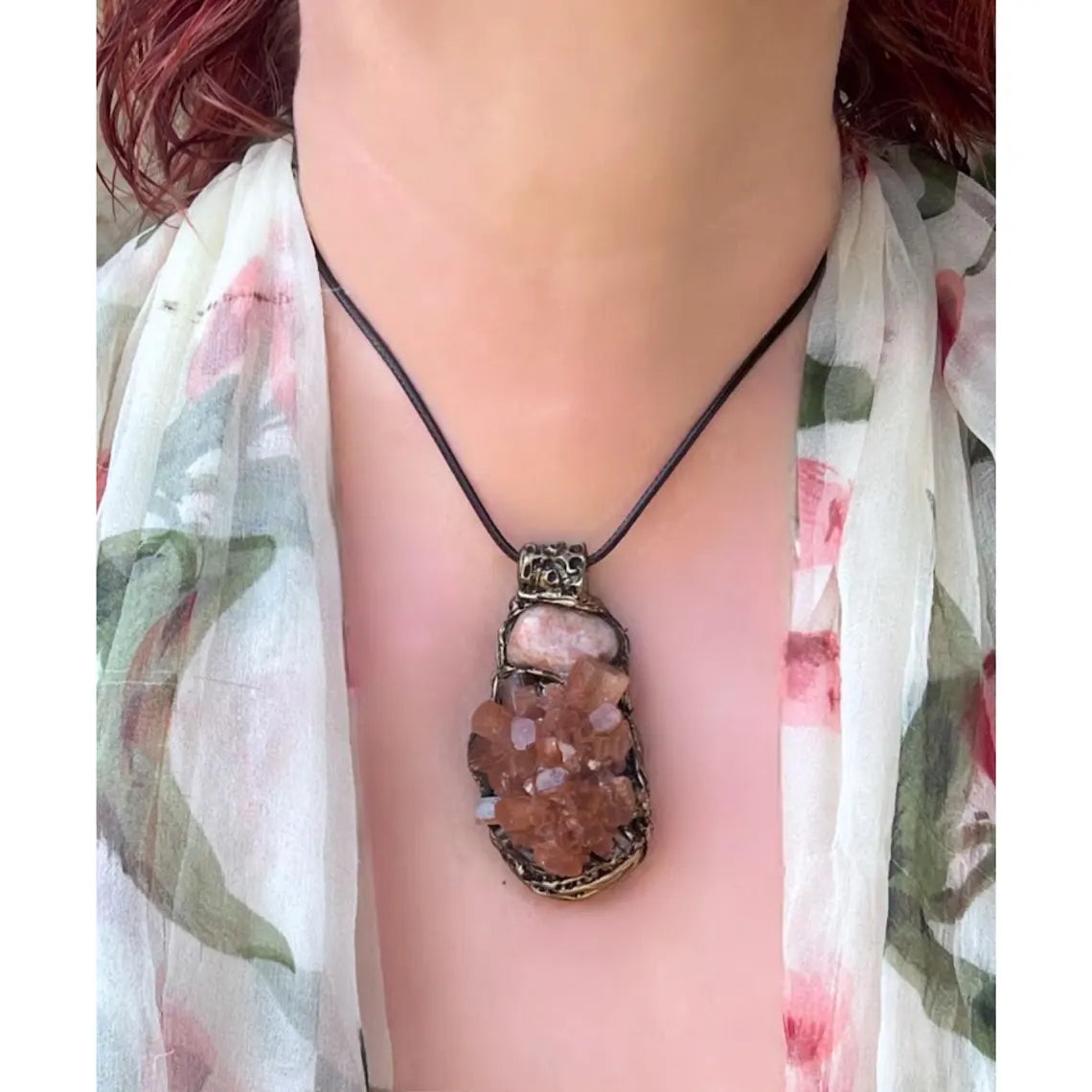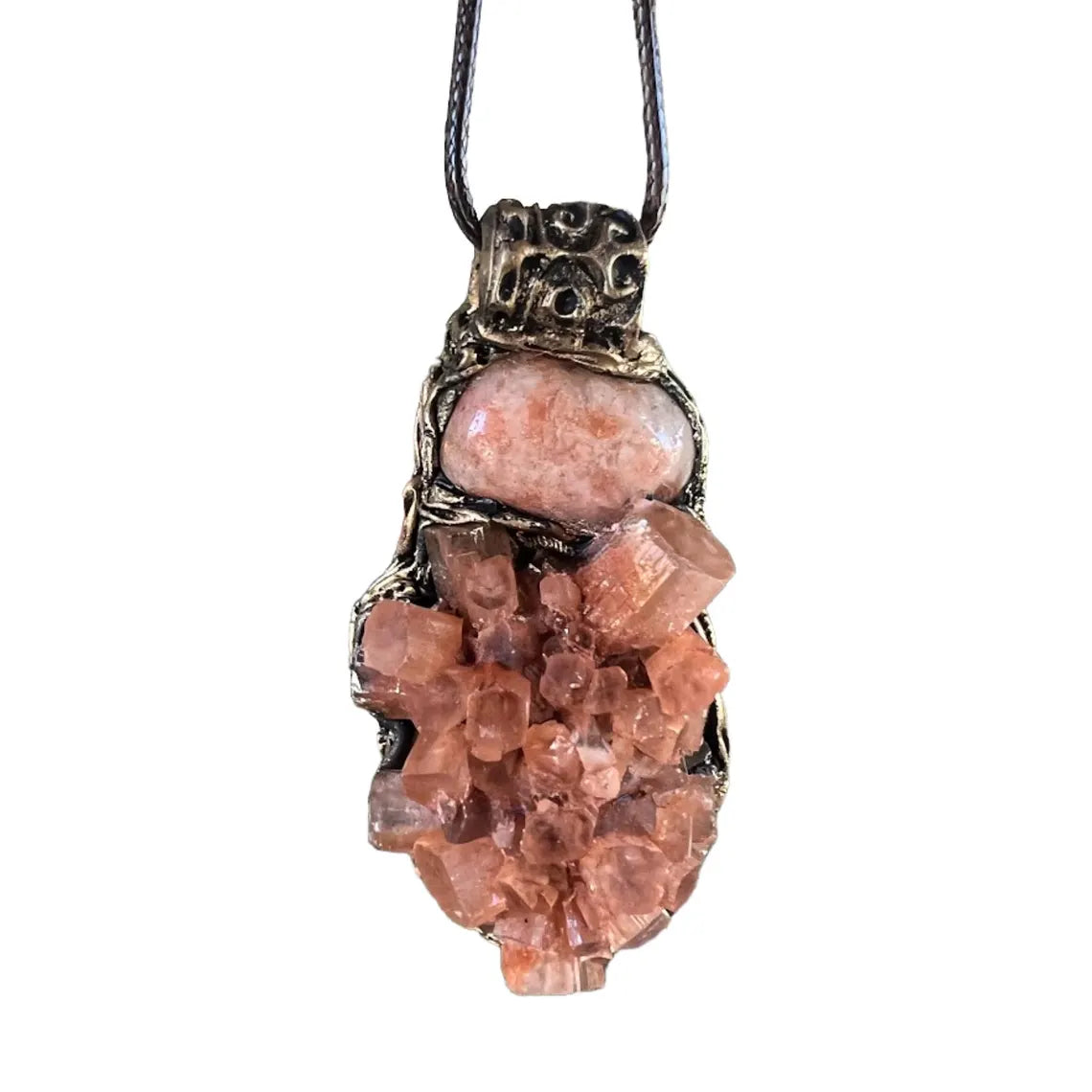 Raw crystal pendant necklace featuring Sunstone and Aragonite – a unique blend of light and grounding energies. Sunstone inspires joy, confidence, and vitality, while Aragonite offers emotional balance, patience, and connection to Earth. This natural gemstone necklace makes a meaningful gift for those seeking clarity and inner harmony.