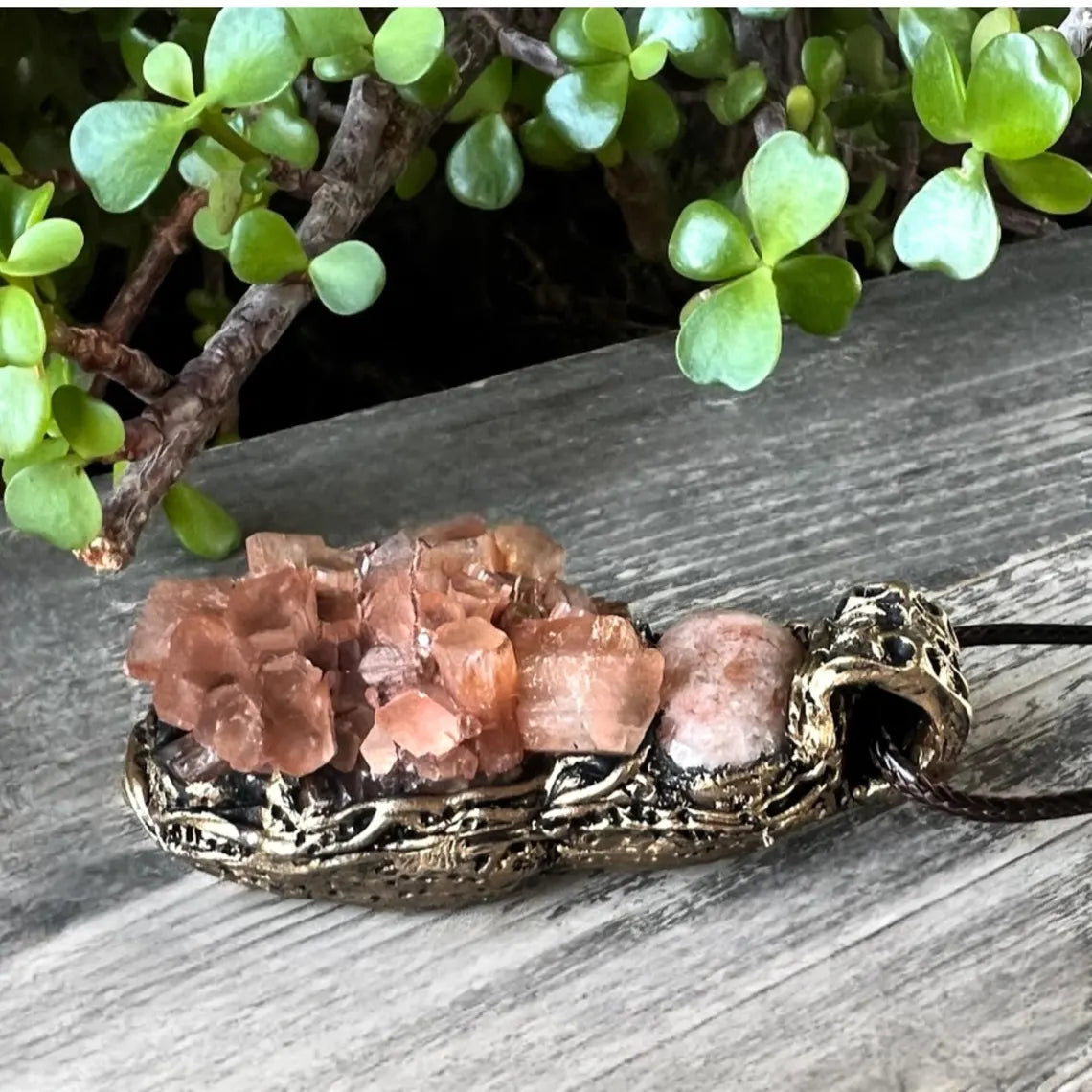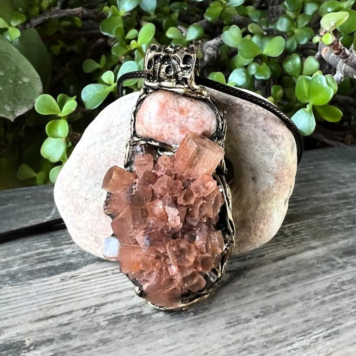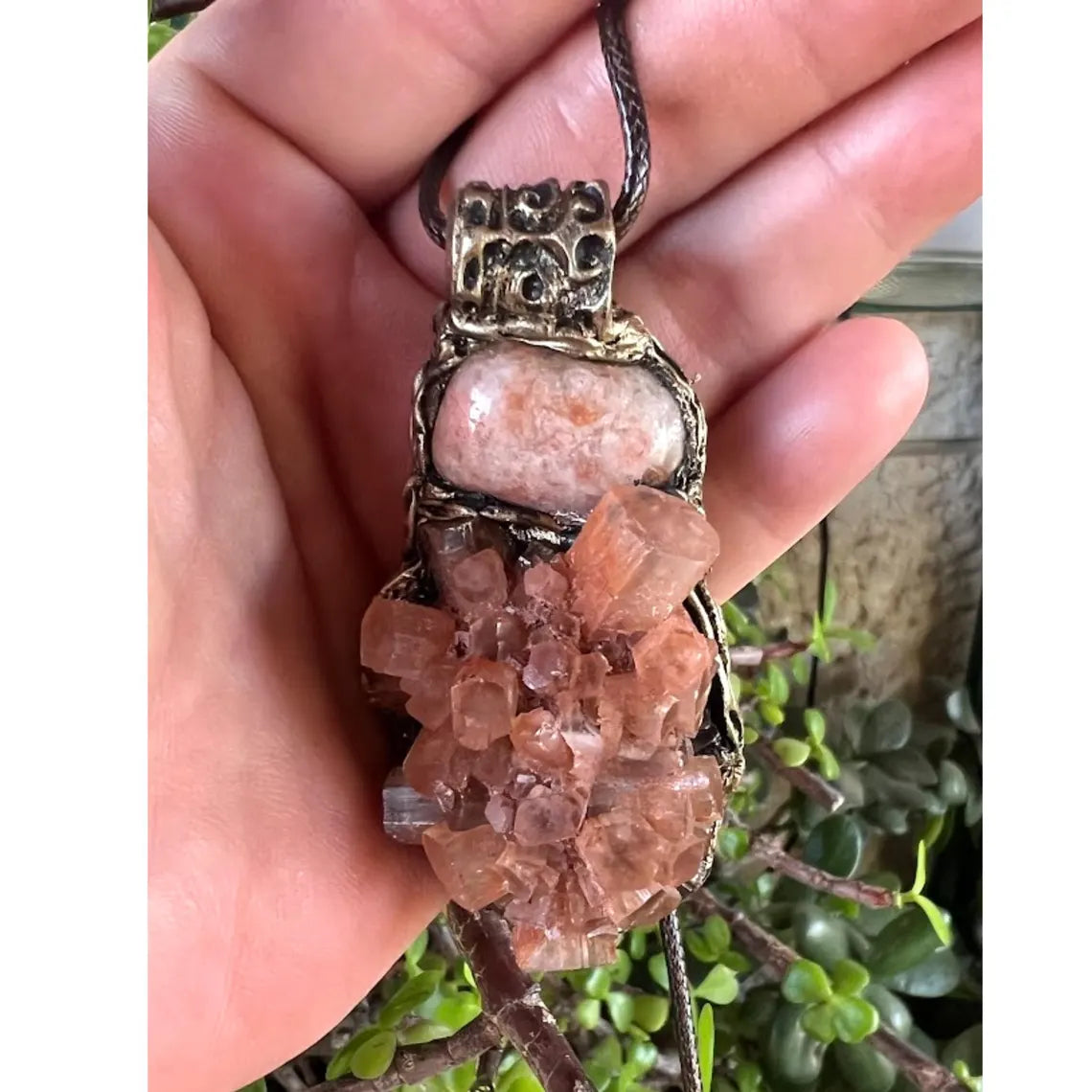 Raw crystal pendant necklace featuring Sunstone and Aragonite – a unique blend of light and grounding energies. Sunstone inspires joy, confidence, and vitality, while Aragonite offers emotional balance, patience, and connection to Earth. This natural gemstone necklace makes a meaningful gift for those seeking clarity and inner harmony.
