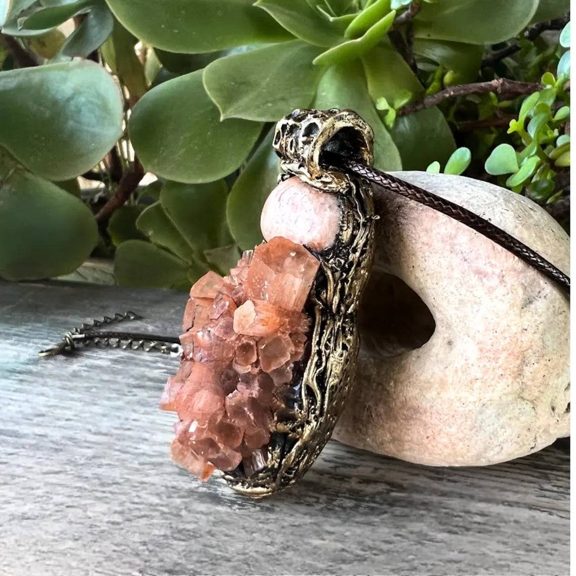 Materials: Aragonite, Sunstone, bronze cord, brass clasp, polymer clay.