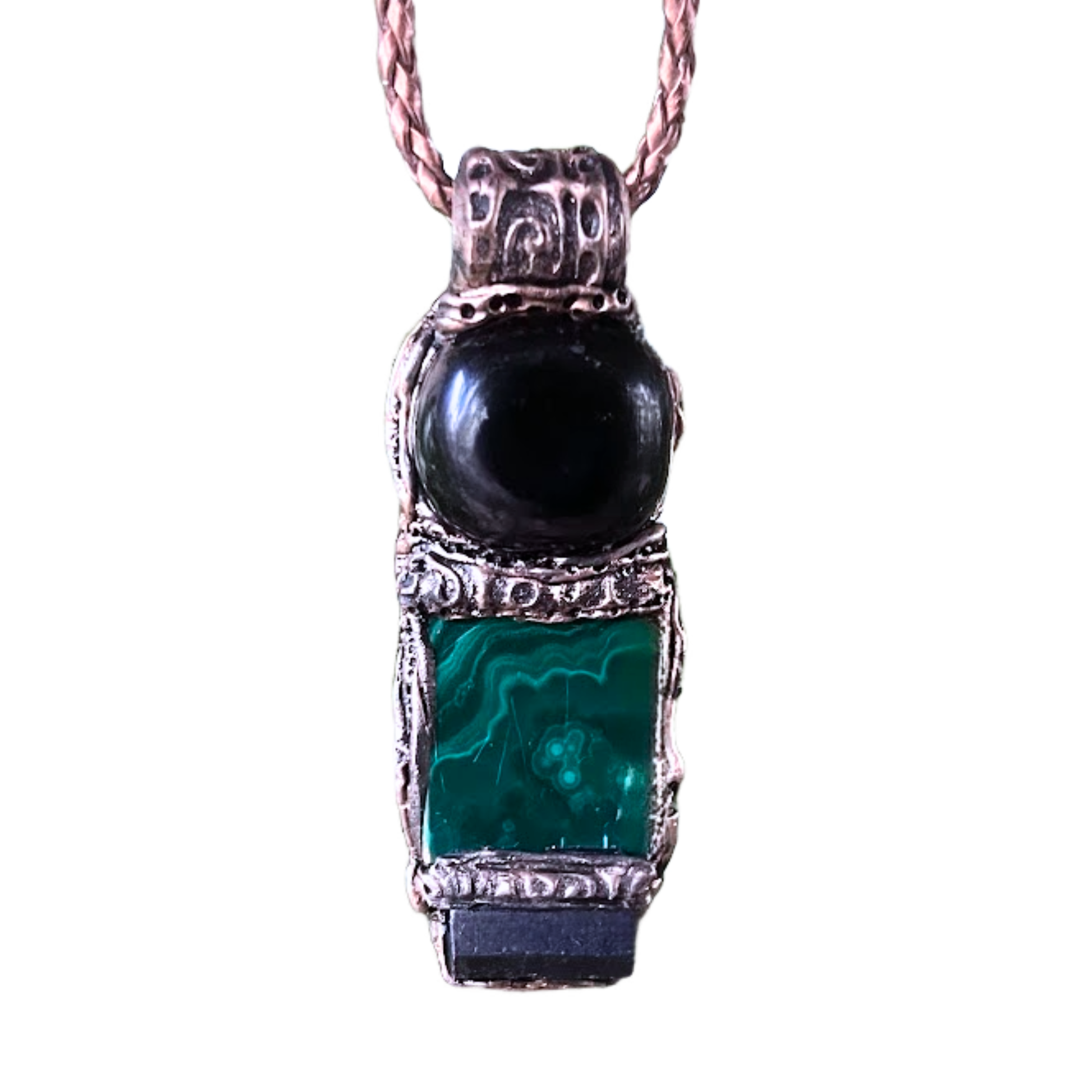 This necklace features a powerful trio of Malachite, black Tourmaline, and Obsidian, each known for its protective and grounding properties. Malachite is renowned for its ability to absorb negative energies and promote emotional balance. Black tourmaline provides grounding and shielding from negativity, while obsidian offers deep protection and clarity. Together, these stones create a potent amulet designed to protect and empower empaths.
