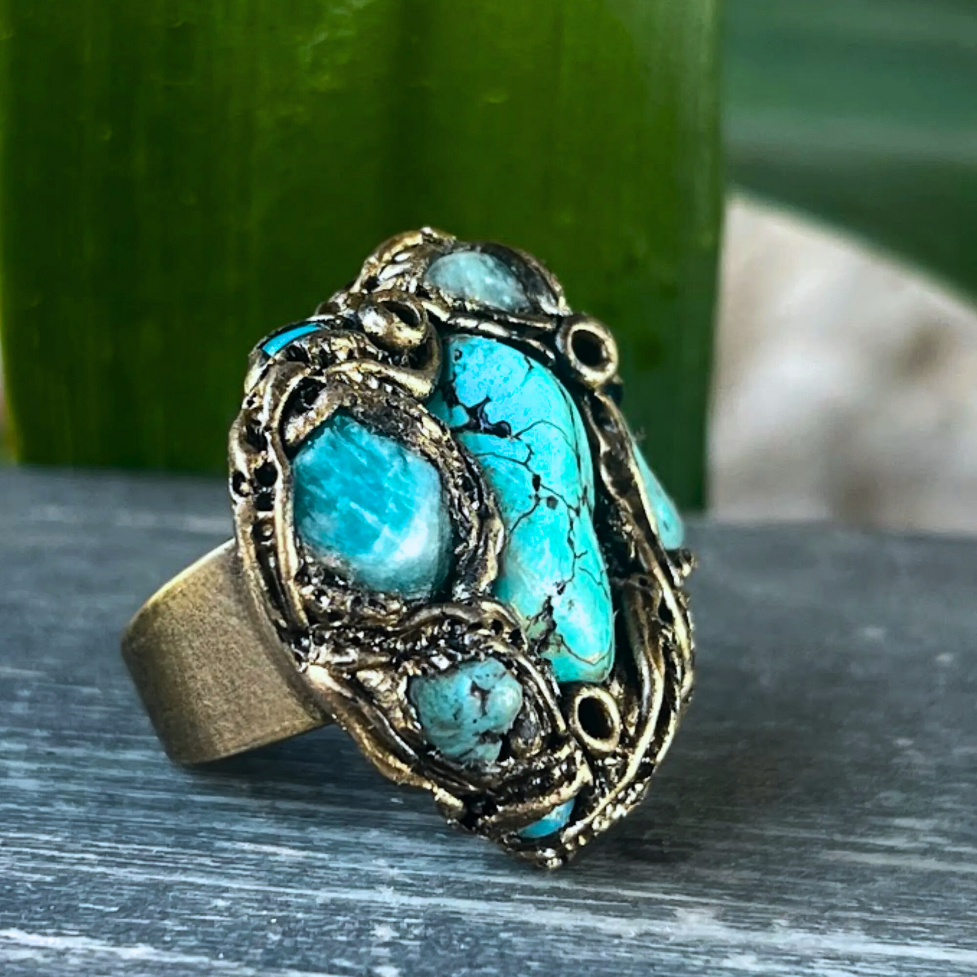 The Turquoise Chunky Amazonite Ring is a magnificent piece designed to add a touch of serenity and elegance to your ensemble. Crafted with care, this raw crystal stone large statement cocktail ring showcases the captivating beauty of turquoise and amazonite.